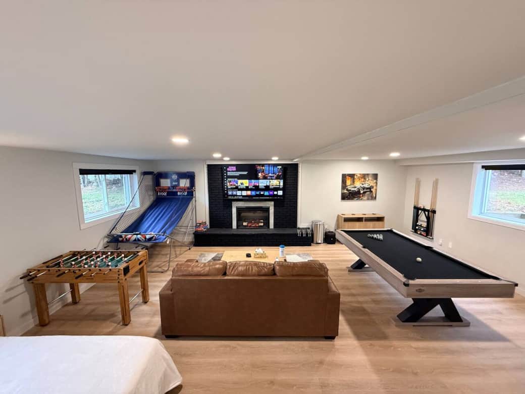 Bedroom: The bedroom is a large suite in itself, featuring the fireplace and 75" TV, pool table, foosball table, and basketball arcade game. There is an additional laundry room in here.