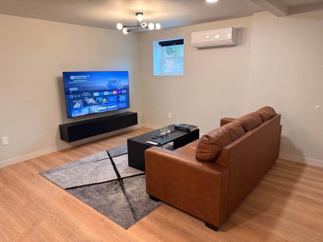 Living/Dining/Kitchen: Open concept room with a 70" TV with Netflix, Hulu, Max, and Prime already logged in.
